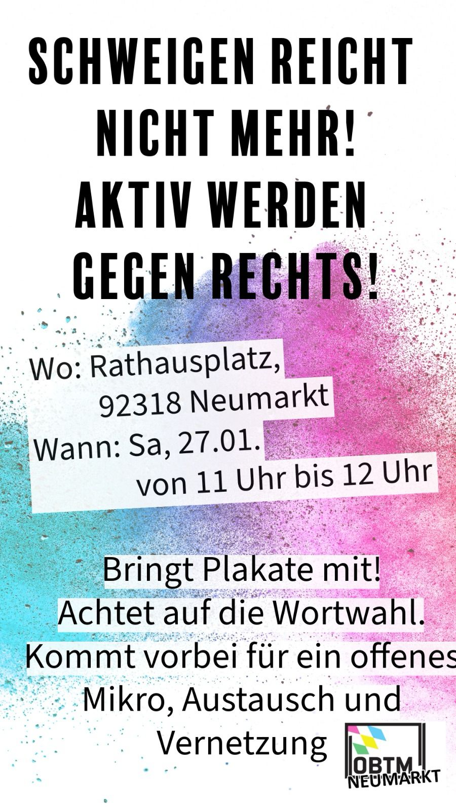 Die Demonstration findet am Samstag den 27.01. von 11 -12 Uhr am Rathausplatz in Neumarkt statt. Es wäre toll wenn wir ähnlich viele Menschen dazu bewegen können wie andere Orte. Bitte erscheint daher zahlreich und teilt auch den Aufruf fleißig.
