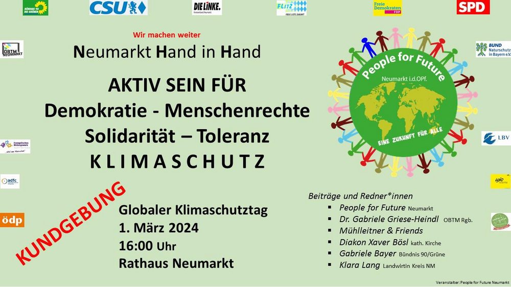 Wir Grüne Neumarkt unterstützen die Kundgebung zum Globalen Klimaschutztag. Sie findet am 1. März 2024 um 16:00 in Neumarkt am Rathausplatz statt. Die Veranstaltung steht unter dem Motto "AKTIV SEIN FÜR Demokratie - Menschenrechte - Solidarität - Toleranz und K L I M A S C H U T Z".