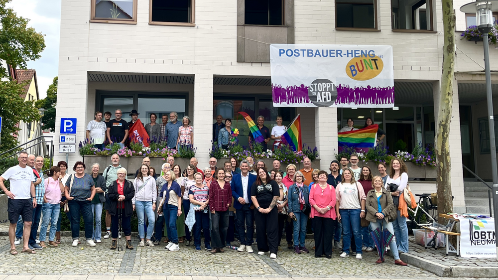 Montagnachmittag in Postbauer-Heng: Dutzende Bürgerinnen und Bürger aus der Marktgemeinde kommen spontan zum Rathaus, um Flagge zu zeigen. Sie wollen nicht hinnehmen, dass Extremisten in ihrem Ort an Infoständen für Nationalismus und Ausgrenzung werben. Pfarrer Markus Fiedler und die dritte Bürgermeisterin und Bezirksrätin Gabriele Bayer sprachen zu den Teilnehmern.