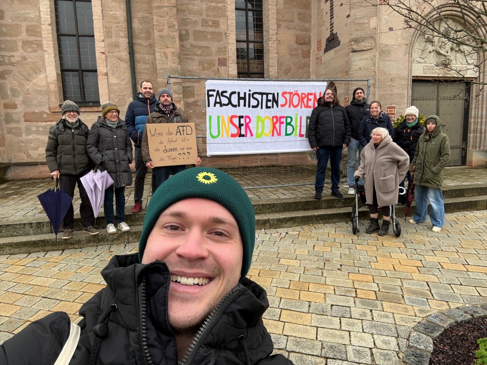 Immer wieder tauchen im Landkreis Aktivisten der laut Verfassungsschutz rechtsextremistischen Partei "AFD" auf, um Anhänger für ihre völkischen Ideen zu werben. Die Infostände werden sehr kurzfristig angemeldet, dann bauen meist auswärtige Parteigänger ihren Infostand auf oder platzieren ihr Fahrzeug mit Parteiwerbung auf einem Marktplatz. Und ebenso schnell sind sie wieder verschwunden. Das Oberpfälzer Bündnis für Toleranz und Menschenrechte (OBTM) organisiert regelmäßig spontane Mahnwachen, wo solche Infostände auftauchen. Die Gegenaktion soll deutlich machen: Die Menschen hier lassen sich nicht vor einen extremistischen Karren spannen. So auch am Montag in Pyrbaum: Kaum waren die Extremisten im Ort, kamen gleich engagierte Pyrbaumer Bürger*innen, um zu zeigen: "Mit uns nicht." Für die Grünen in Pyrbaum und ihren Spitzenkandidaten Dennis Schlötterer ist es selbstverständlich, dabei auf dem Platz zu stehen.
